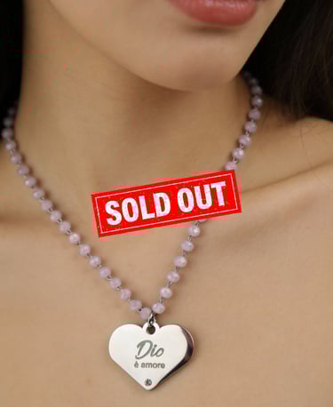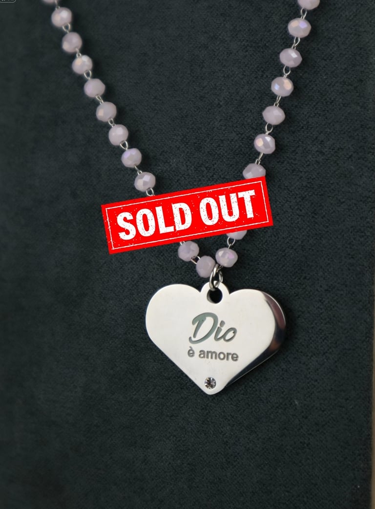 Descrizione: Collana con palline in vetro rosa e ciondolo a forma di cuore inciso con swarovski