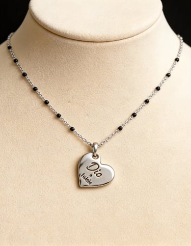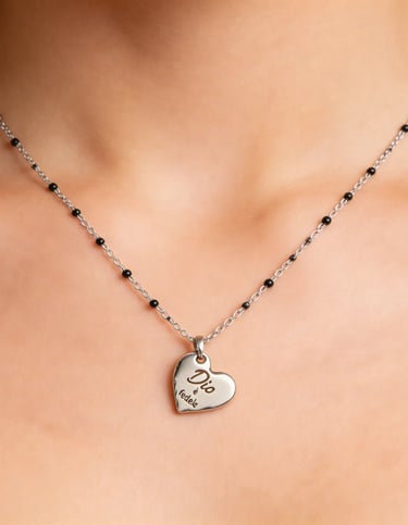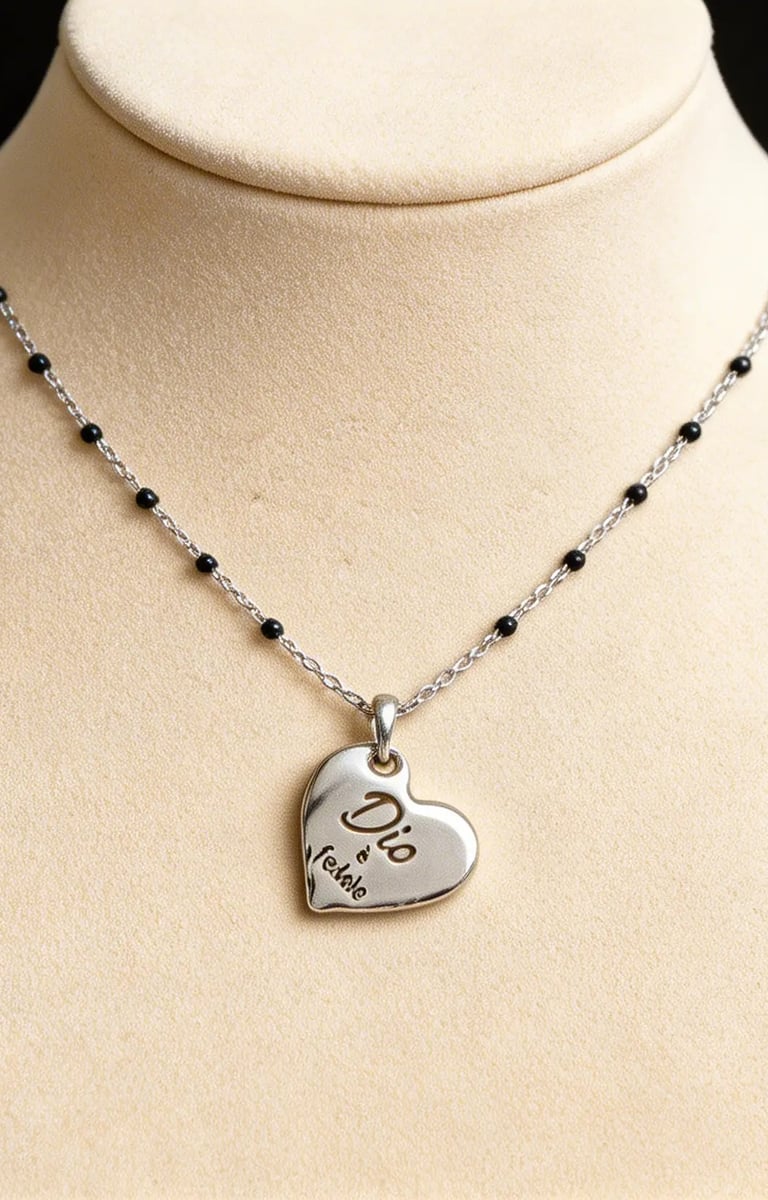 Descrizione: Collana con sfere smaltate e ciondolo a forma di cuore inciso e swarosky