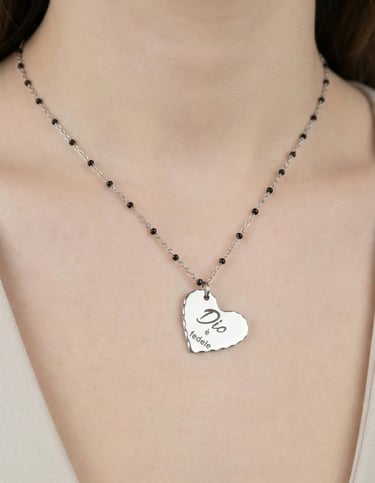 Descrizione: Collana con sfere smaltate e ciondolo a forma di cuore inciso e swarosky