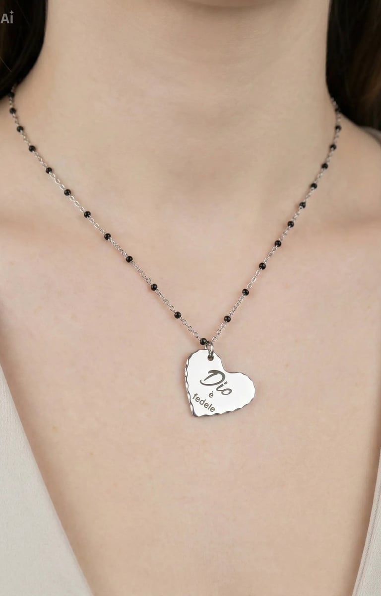Descrizione: Collana di perle con ciondolo a forma di cuore inciso con swaroski